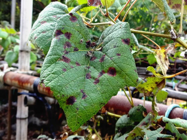 褐斑病 中央部黒褐色、周辺褐色の多角形病斑