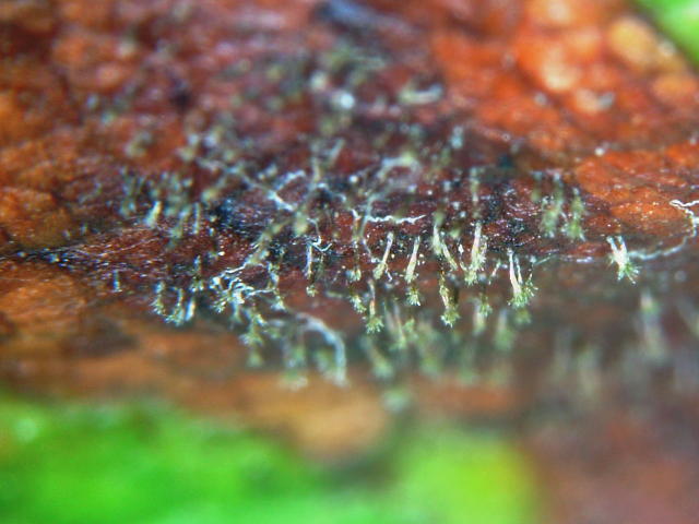 褐斑病 葉表病斑から束状に立ち上がった分生子柄