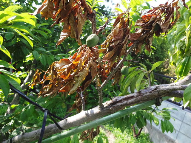 胴枯病 幹に裂け目を生じ、枝が枯れる(5月下旬)