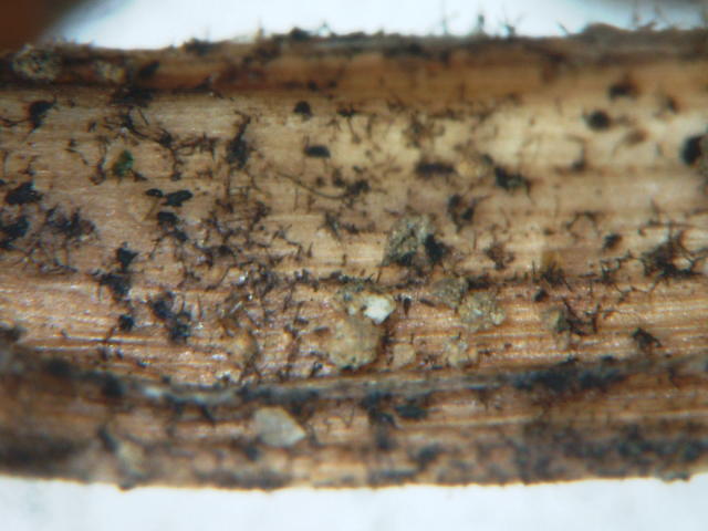 アルタナリア属菌による葉枯れ 発病葉柄上の分生子