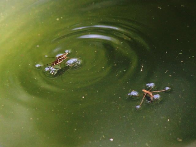 交尾中のヒメアメンボ(体長10mmで黒褐色)とヒメイトアメンボ(体長9mmで褐色)