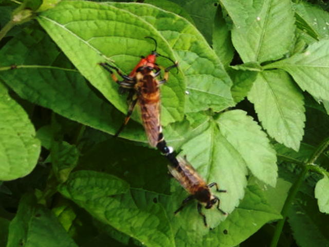 ハムシ類を捕獲したシオヤアブ成虫(体長30mm)のつがい