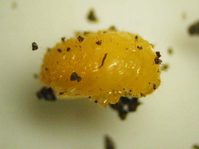 コメント:ヘリグロテントウノミハムシ蛹(体長3.5mm)