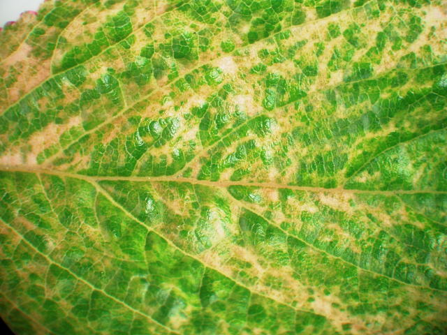 黄色網斑病 細かい葉脈に囲まれた範囲ごとに黄と緑のモザイクになる