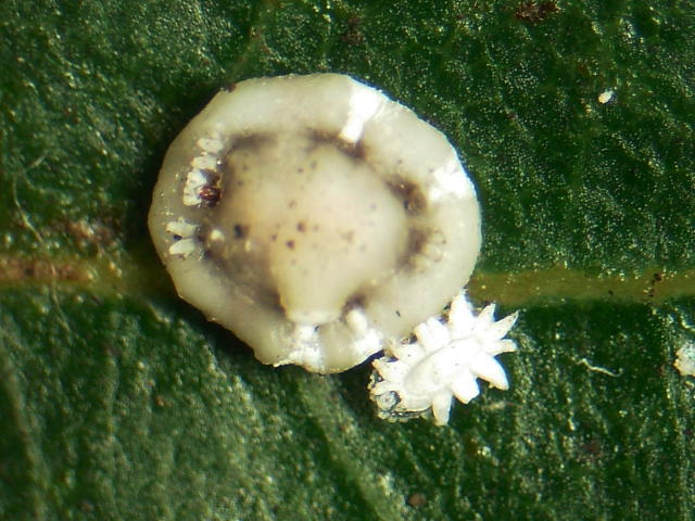 カメノコロウムシ成虫(体長2.8mm)と幼虫(体長1mm)