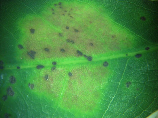 裏うどんこ病 薄紫色の葉表病斑(黒点は表黒点病の病斑)