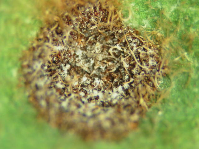コメント:葉ぶくれ病 発病が進むと白色の粉状物に覆われる