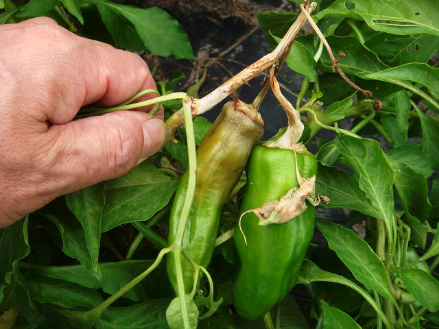 菌核病 茎と果実が淡褐色になり軟化する