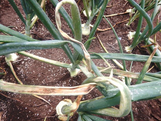 葉枯病 病斑に沿って葉が黄化し、よじれる