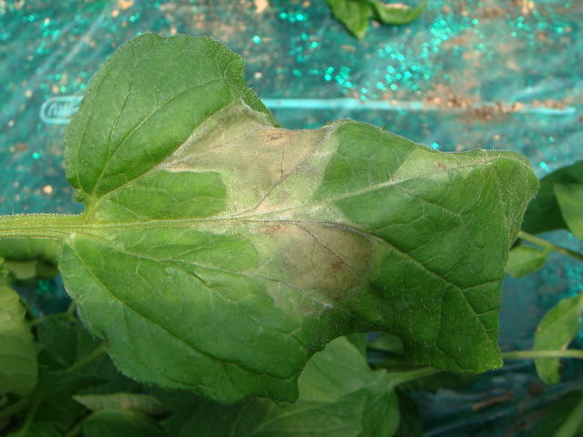 疫病 病斑の表面に白色の薄いカビが発生