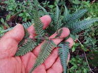 | 多年草 草丈:30cm〜60cm 生育場所:日陰など 特徴:葉が柔らかいシダ類で、葉の柄は赤紫色。 名前の由来:ワラビに似るが、食用にならず価値がないため「イヌ」。 |