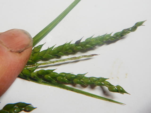 ジュズスゲ 雌小穂(長さ40mm)の間に雄小穂(長さ20mm)