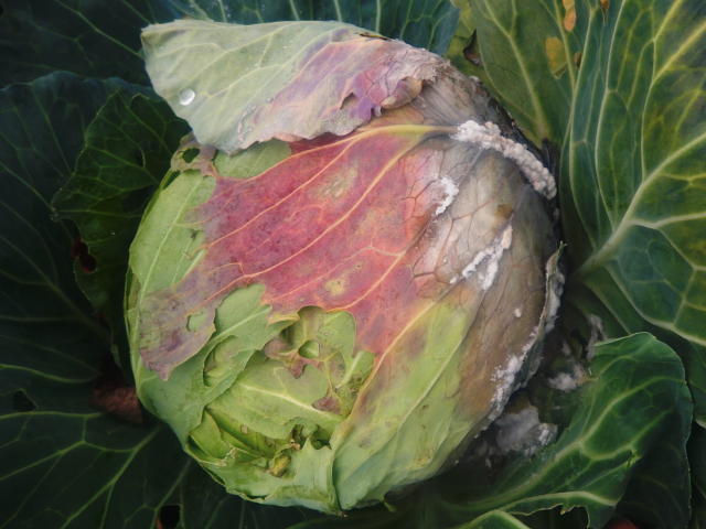 菌核病 結球葉の1枚目が変色し、菌糸が発生