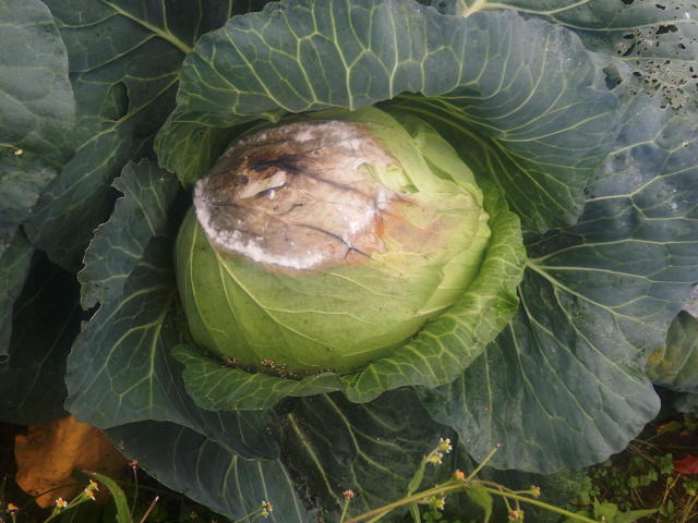 菌核病 結球葉の1枚目が褐変し、菌糸が発生