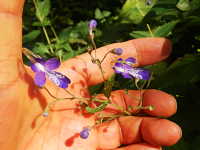 | 多年草 草丈:80cm〜100cm 花期:9月〜10月 生育場所:林縁など 特徴:青紫色のやや大型の花で、雄しべと雌しべが弓なりに長く突き出る。 名前の由来:特徴的な花形が、空を飛ぶ |