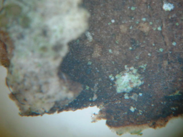 こうやく病 裏面の白色の菌糸と青白色の胞子
