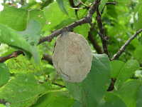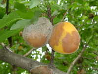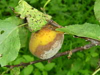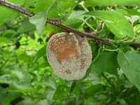 | 発生時期:6月〜7月 病原:糸状菌(かび) 伝染方法:発病果梗、発病枝及び地表に落ちた発病果上の病原菌が伝染源となる。 被害:果実が腐敗し、灰色のかびで覆われる。 |