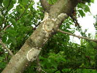 被害:細い枝では厚い菌糸膜に覆われることにより枯死することがある。美観を損ねる。