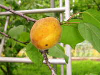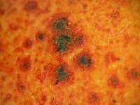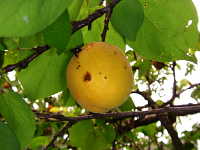 | 発病時期:6月〜7月 病原;糸状菌(かび) 伝染方法:病原菌は新梢上の病斑で越冬して伝染源となる。 被害:果実と新梢に発病し、黒褐色の円形病斑を生じる。 |