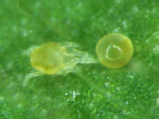 カンザワハダニ幼虫(体長0.13mm)及び卵(直径0.12mm)