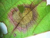 | 発生時期:10月 病原:糸状菌(かび) 伝染方法:落葉上の病原菌が伝染源となる。 被害:外周赤紫色で内部淡褐色の円形〜楕円形病斑を生じる。 |