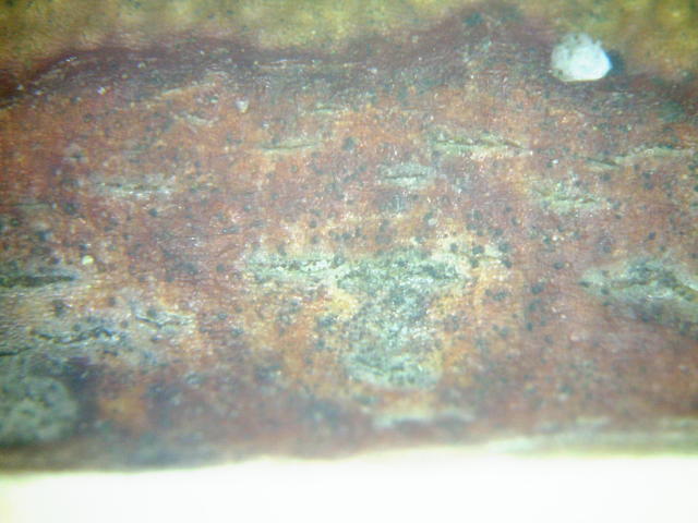 枝枯病 赤い病斑上に黒色小粒点が点在