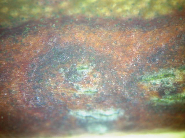 枝枯病 赤い病斑上に黒色小粒点が点在