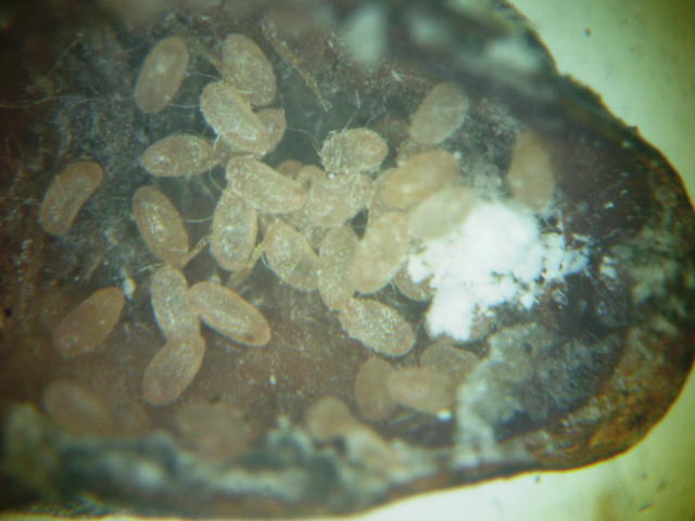 ミズキカタカイガラムシ成虫体内の幼虫(体長0.3mm)と卵(長径0.2mm)