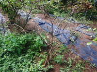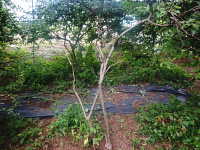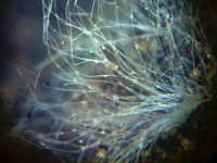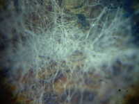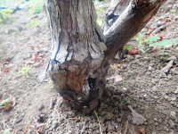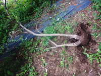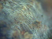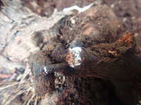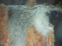 被害:根の表面が白色の菌糸束で覆われる。樹勢は弱り、果実は小型化する。