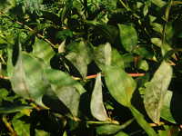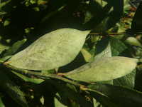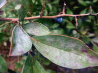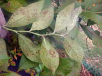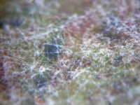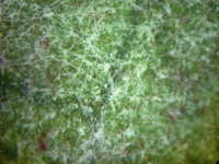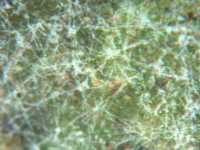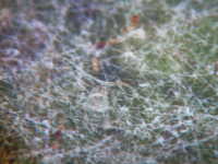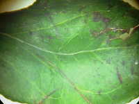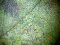 | 発生時期:9月 病原:糸状菌 伝染方法:発病葉上の病原菌が伝染源となる。 被害:葉がゆがみ、葉裏に薄黒色の斑紋を生じ、白い菌糸が薄く覆う。 |