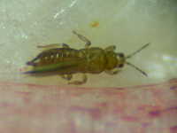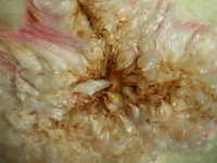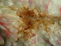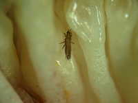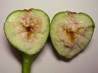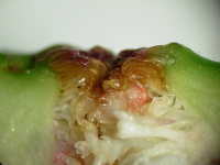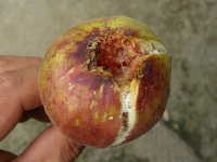 | 発生時期:6月〜7月 被害:成虫及び幼虫が果実開口部から侵入し、食害すると果肉が褐変腐敗する。 |
