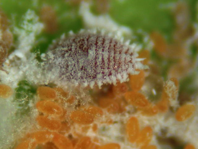 フジコナカイガラムシ老齢幼虫(体長2mm)及び卵