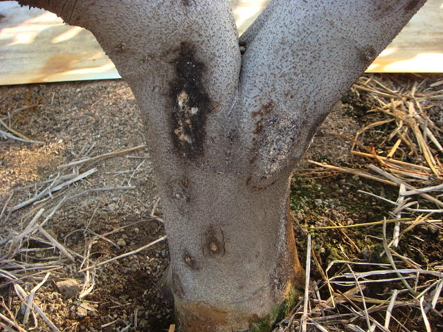 株枯病 主幹に褐色のへこみとクリーム色のかびが見える
