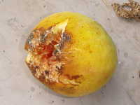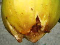 被害:果実開口部が裂けて果汁が漏出し、果実内部に白色水泡を生じ、次第に腐敗する。