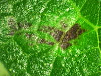 | 発生時期:6月〜10月 病原:糸状菌(かび) 伝染方法:病原菌は枝の病斑で越冬し、伝染源となる。 被害:果実では灰褐色の小斑点が互いにくっつきカサブタ状となる。葉では褐色の小斑点を生じ、葉が奇形となる。 |