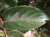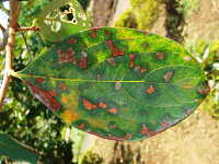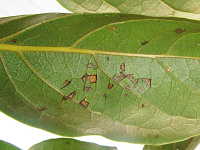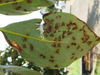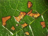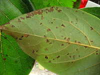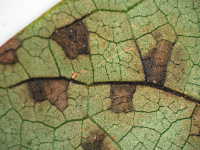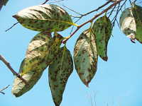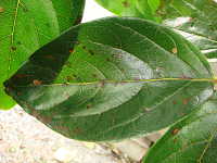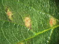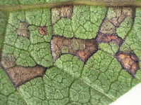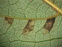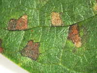 被害:葉に葉脈で囲まれた角斑を生じる。落葉は円星落葉病ほど激しくない。