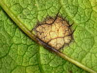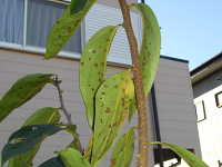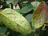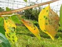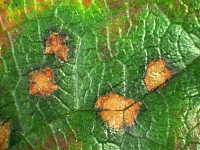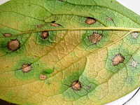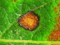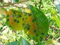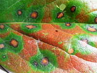 | 発生時期:9月〜11月 病原:糸状菌(かび) 伝染方法:病原菌は落葉上で越冬し、伝染源となる。 被害:周縁が黒紫色、内部が赤褐色の円形病斑を生じ、早期落葉しやすい。 |
