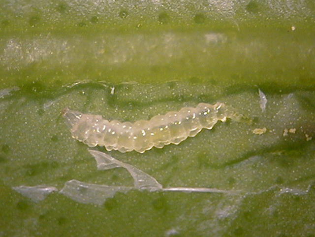 ミカンハモグリガ中齢幼虫(体長2.5mm)