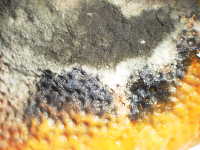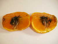 | 発生時期:1月 病原:糸状菌(かび) 伝染方法:病原菌は生育期間中は果皮の傷や 被害:果頂部を中心に暗褐色となってやや陥没し、表面に黒灰色でビロード状のかびを生じる。 果実内部も黒変する。 |