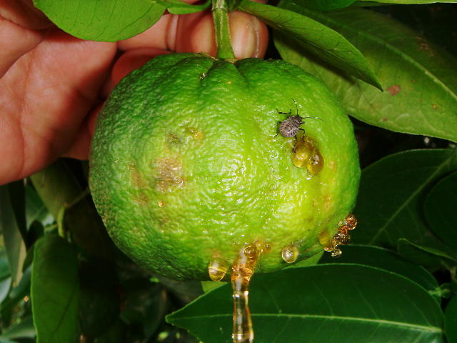 クサギカメムシ3齢幼虫によるシシユズの寄生果 吸汁箇所は窪む