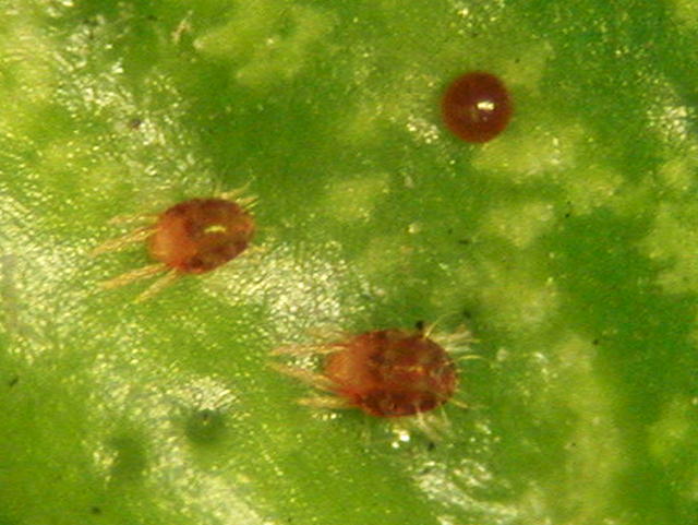 ミカンハダニ卵(直径1mm)、幼虫(体長0.15mm)、第1若虫(体長0.2mm)