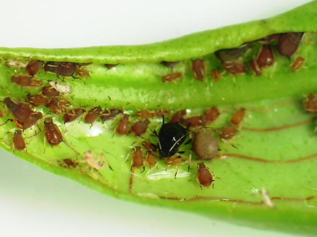 ミカンクロアブラムシ成虫(体長2.5mm)及び幼虫