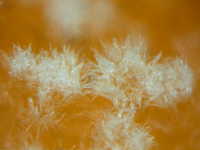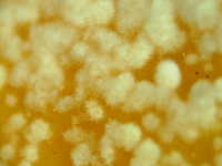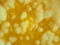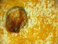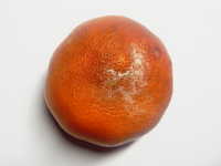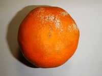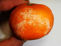 | 発生時期:貯蔵前期 病原:糸状菌(かび) 伝染方法:病原菌はカンキツ園内の土壌中で越夏し、秋期に胞子が風で飛散し、果実に付着して貯蔵庫に持ち込まれて発病する。 被害:果実が水浸状に軟化し、白いかびが発生する。 |