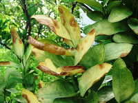 | 発生時期:7月 病原:糸状菌(かび) 伝染方法:樹上の枯れ枝で越冬した病原菌が雨滴により伝染する。 被害:葉に褐色円形病斑を生じ、葉が黄化、落葉する。 |
