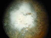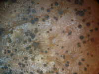 | 発生時期:10月 病原:糸状菌(かび) 伝染方法:樹上の枯れ枝で越冬した病原菌が雨滴により伝染する。 被害:果実に周囲黒褐色の円形病斑を生じる。病斑内には黒色小粒点があり、白色の菌糸を生ずる。 参考:早生ウンシュウミカンで、樹冠外側の陽光面の果実に発生しやすい。(日焼けによる果皮障害部に炭疽病菌が感染する。) |