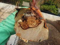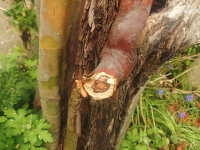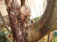 | 発生時期:周年 病原:糸状菌(かび) 伝染方法:病原菌は発病部から降雨時に胞子を飛散させ、伝染する。なお、病原菌は、剪定による枝の切り口や害虫の被害カ所などから侵入する。 |