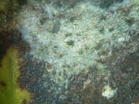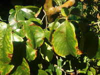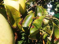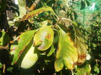 被害:葉脈に囲まれた褐色病斑を生じる。病斑は葉縁に多く、中心には白カビが発生する。
