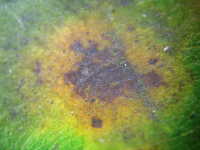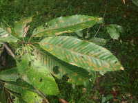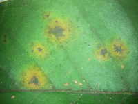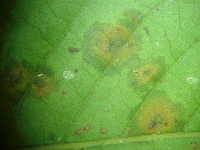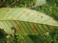 | 発生時期:7〜9月 病原:糸状菌 伝染方法:罹病した落葉や落葉痕芽基部周辺にできた病斑上で越冬し、翌春にそこから子のう胞子を飛散して伝染する。 被害:多発すると早期落葉する。 |