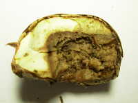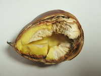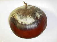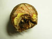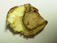 | 発生時期:9月〜10月 被害:果皮が黒くなり、果肉が褐色〜黒褐色に変色する。 |