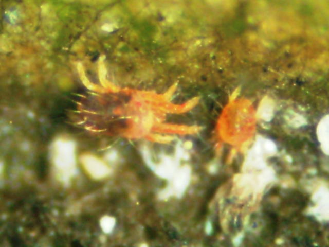 トドマツハダニ若虫(体長0.15mm)、幼虫(体長2mm)